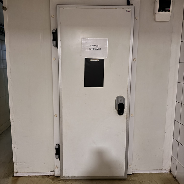 egyszárnyú hűtőkamra nyílóajtó, kézi nyitással, bentrekedés elleni védelemmel. Valamennyi ajtónál ajtónyitás kapcsolóval - hűtés megszakítással, világítás felkapcsolással